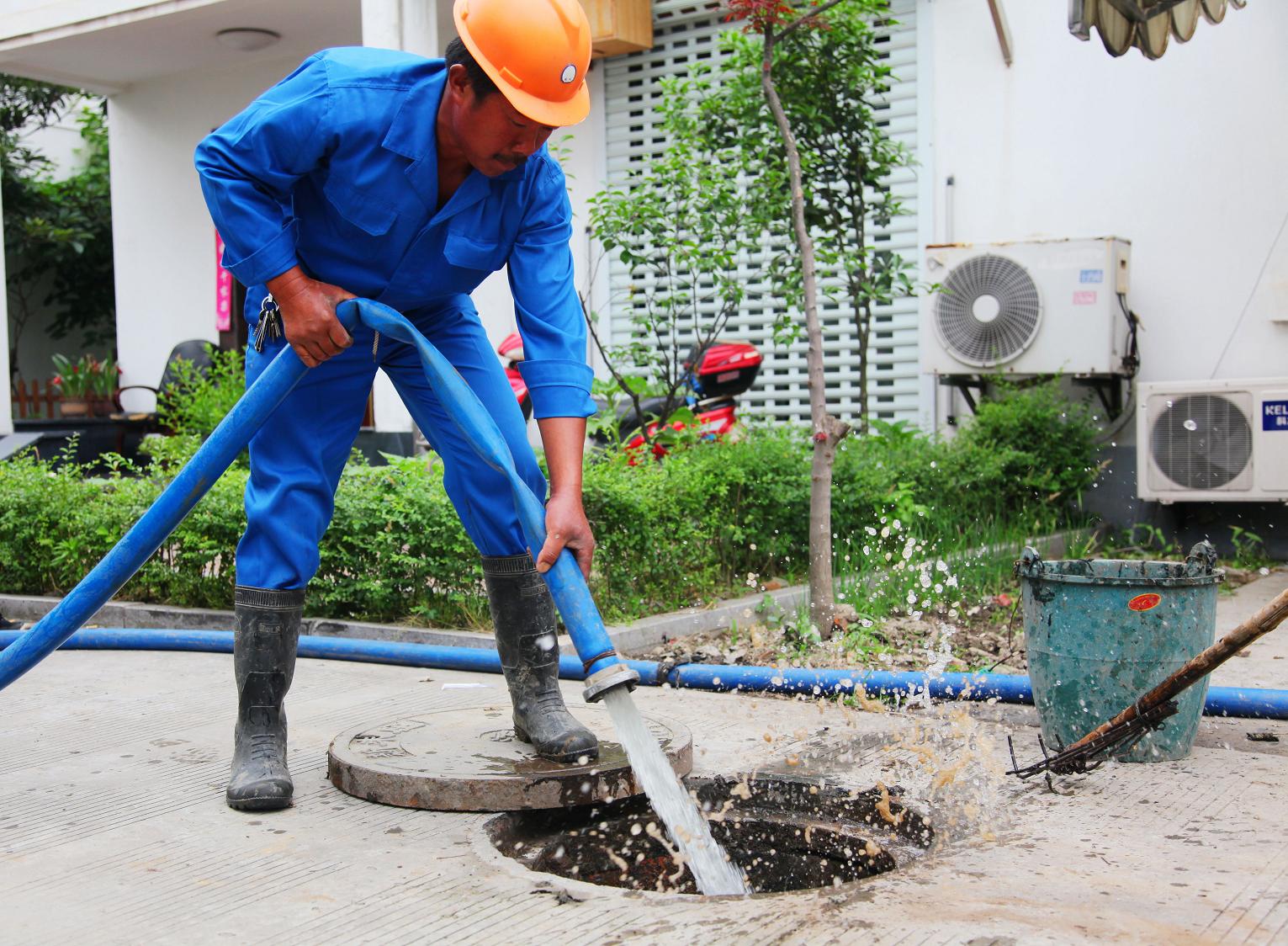圖為施工人員正在對小區(qū)內(nèi)污水管道進(jìn)行疏通