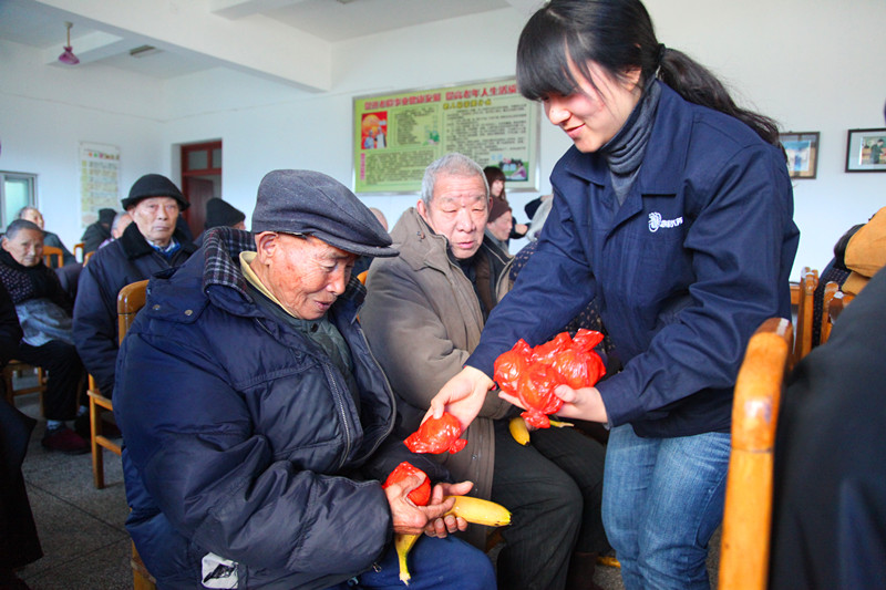 志愿者為夕陽紅敬老院老人分發水果、毛巾等物品